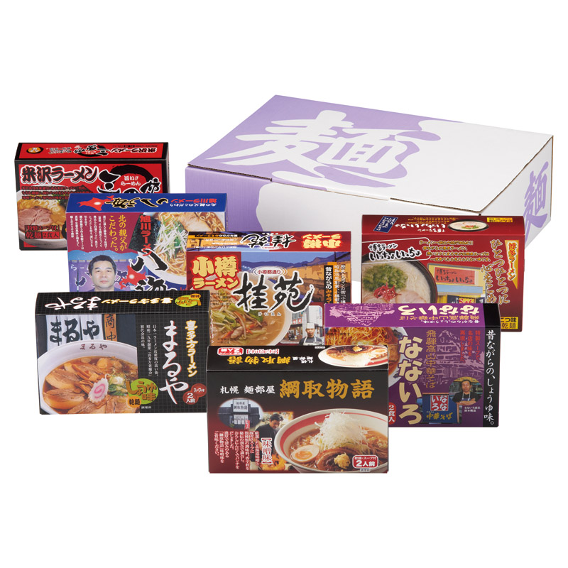【内容】 北海道小樽ラーメン「桂苑」味噌味(2食入)(約252g)、北海道札幌ラーメン「綱取物語」味噌味(2食入)(約288g)、北海道旭川ラーメン「八海」醤油味(約254g)、喜多方ラーメン「まるや」醤油味(2食入)(約220g)、米沢ラーメン「三男坊」味噌味(2食入)(約268g)、飛騨高山中華そば「なないろ」(2食入)(約250g)、博多ラーメン「いっちょいっちょ」豚骨味(2食入)(約230g)×各1