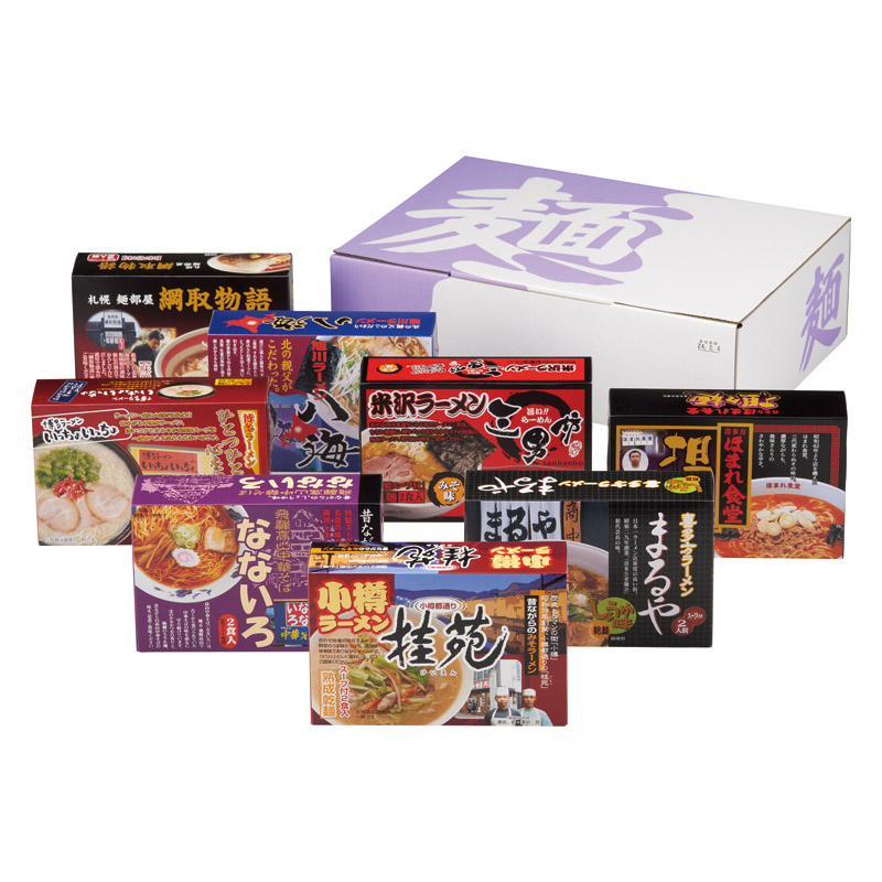 【内容】 北海道小樽ラーメン「桂苑」味噌味(2食入)(約252g)、北海道札幌ラーメン「綱取物語」味噌味(2食入)(約288g)、北海道旭川ラーメン「八海」醤油味(2食入)(約254g)、喜多方ラーメン「まるや」醤油味(2食入)(約220g)、喜多方ラーメン「ほまれ食堂」担々麺(2食入)(約282g)、米沢ラーメン「三男坊」味噌味(2食入)(約268g)、飛騨高山中華そば「なないろ」(2食入)(約250g)、博多ラーメン「いっちょいっちょ」豚骨味(2食入)(約230g)×各1