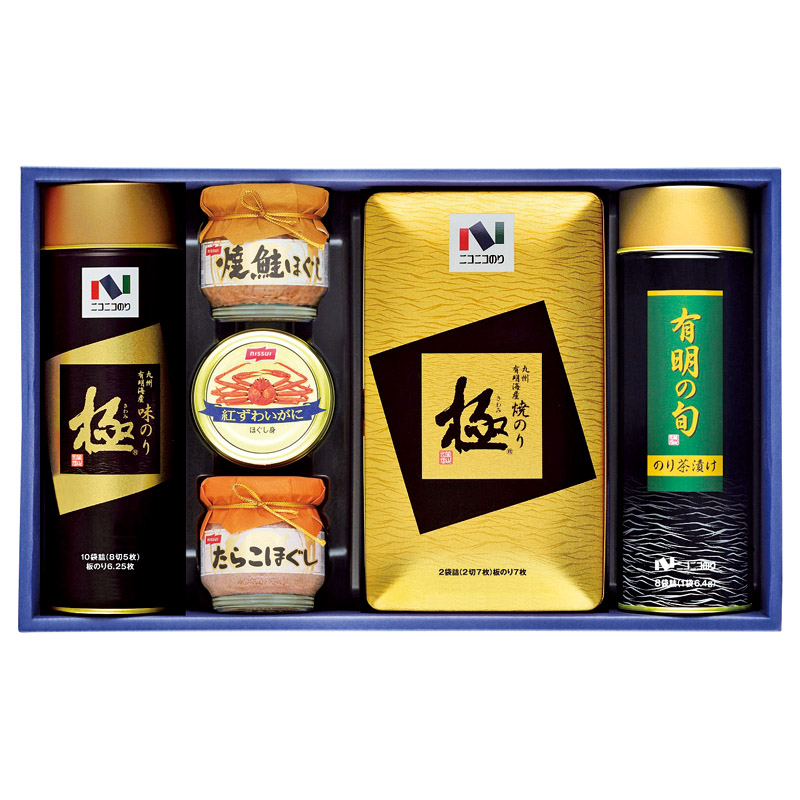 九州有明海産の上質な海苔「極」の焼のりに缶詰、瓶詰を詰合せました。