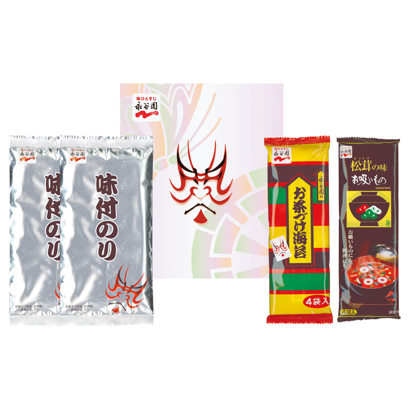 【内容】 味付のり(8切5枚5袋)×2、お茶づけ海苔(6g×4袋)、松茸の味お吸いもの(3g×4袋)×各1