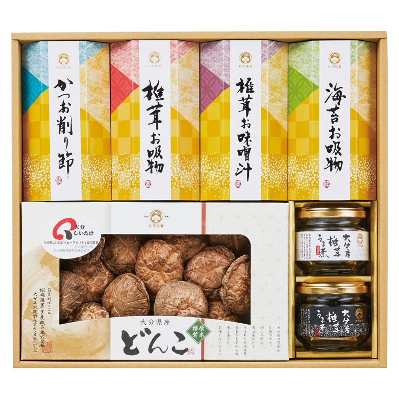 【内容】 大分産原木乾椎茸どんこ(約50g)、大分産椎茸うま煮(約55g)、大分産椎茸うま煮(きざみ)(約55g)、椎茸お味噌汁(九州合わせみそ)(2P)、海苔お吸物(2P)、椎茸お吸物(あごだし)(2P)、鹿児島県枕崎産かつお削りぶし(約3g×3P)×各1