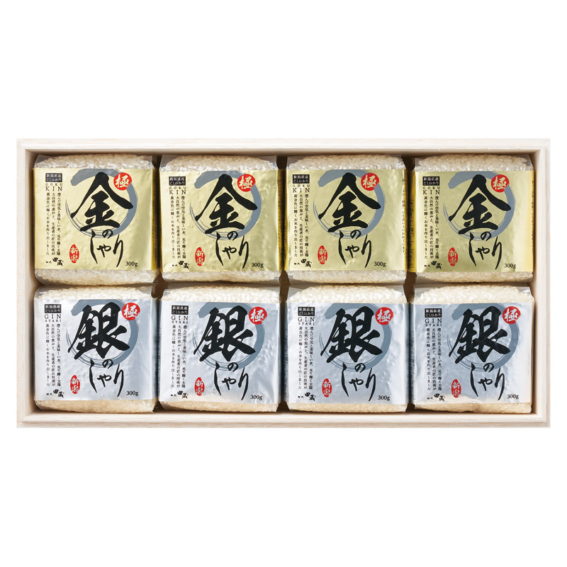 【内容】 新潟県産コシヒカリ(8分づき)(約300g)、新潟県産こしひかり(約300g)×各4