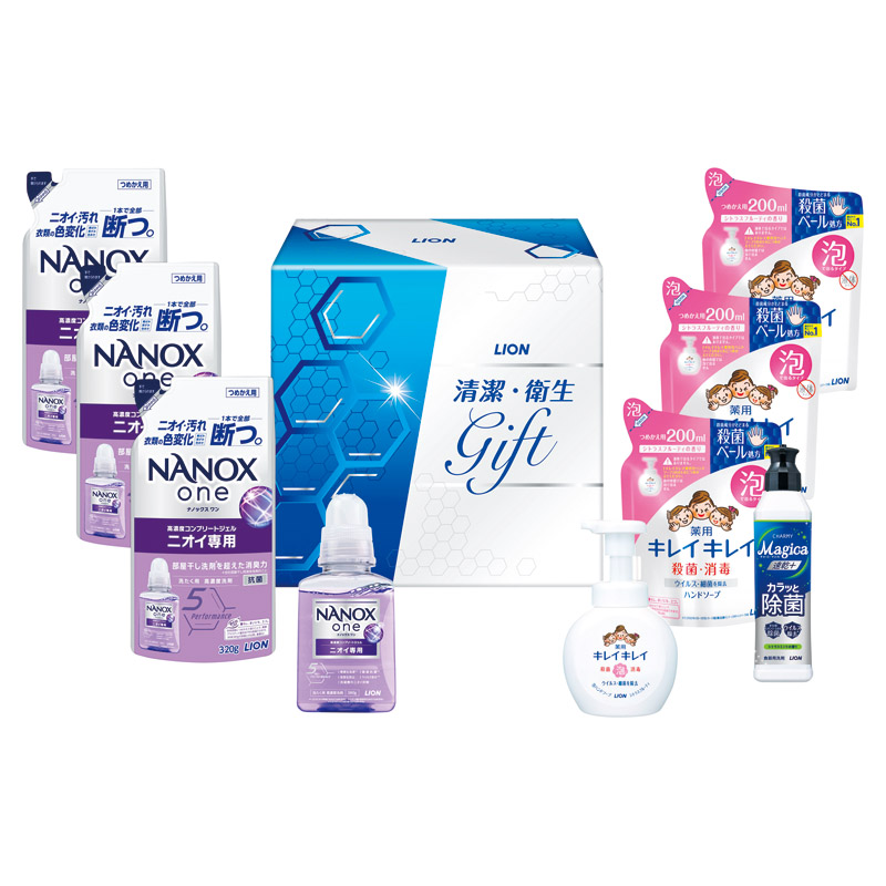【内容】 ナノックスワンニオイ専用(約380g)、キレイキレイ薬用泡ハンドソープ(約250ml)、チャーミーマジカ速乾+カラッと除菌シトラスミントの香り(約220ml)×各1、ナノックスワンニオイ専用詰め替え(約320g)、キレイキレイ薬用泡ハンドソープ詰め替え(約200ml)×各3