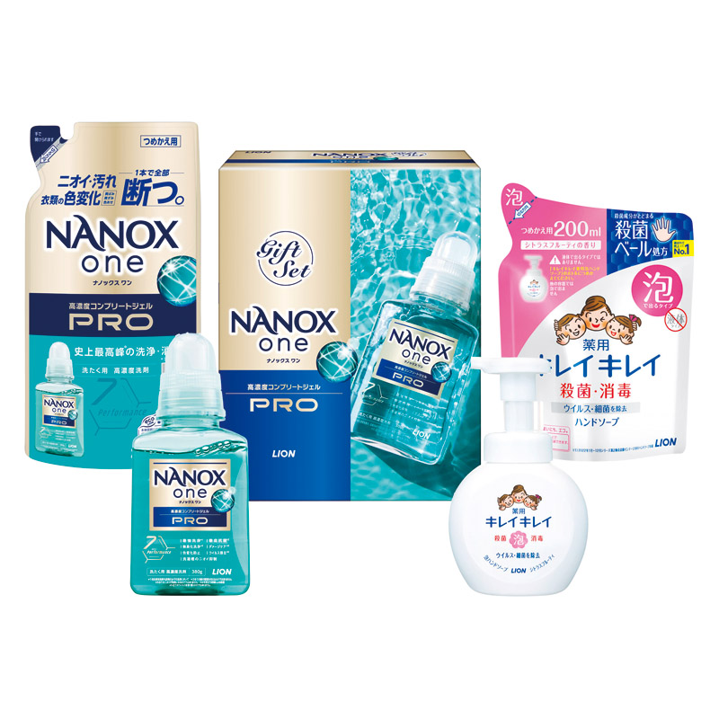【内容】 ナノックスワンプロ(約380g)、ナノックスワンプロ詰め替え(約320g)、キレイキレイ薬用泡ハンドソープ(約250ml)、キレイキレイ薬用泡ハンドソープ詰め替え(約200ml)×各1