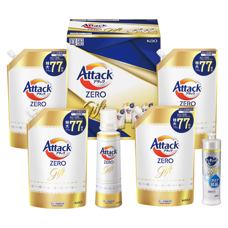 【内容】 アタックZERO(約580g)、キュキュットクリア除菌(約240ml)×各1、アタックZERO詰め替え(約770g)×4