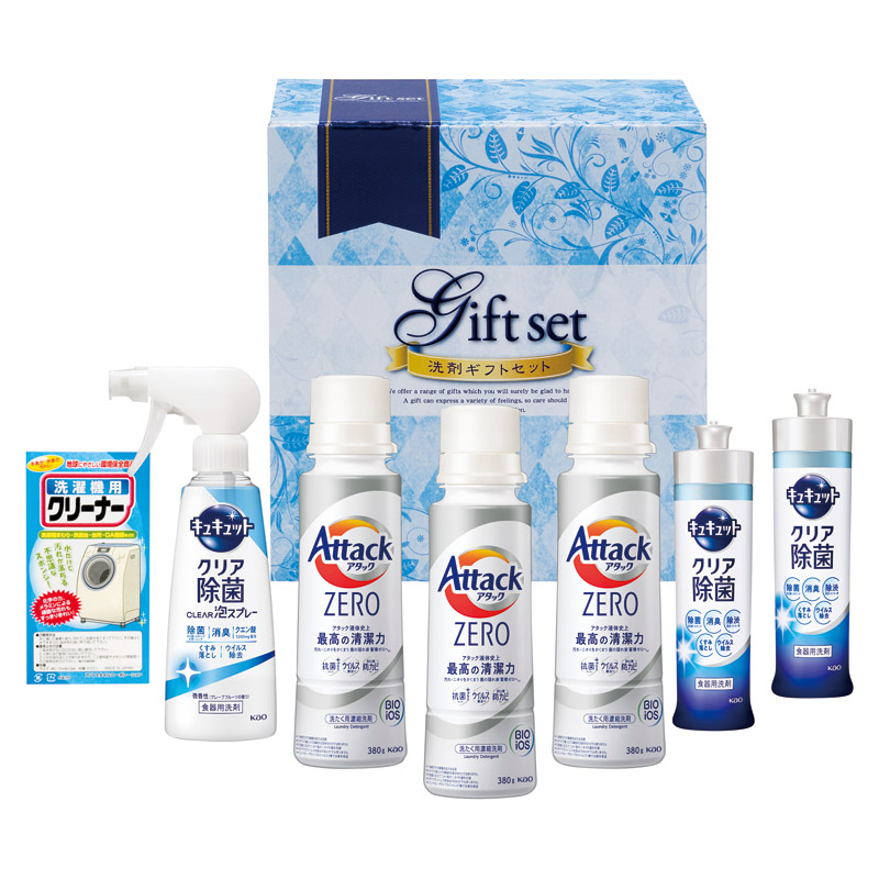 【内容】 花王アタックゼロ(約380g)×3、花王キュキュットクリア除菌(約240ml)×2、花王キュキュットクリア除菌泡スプレー(約280ml)、洗濯機用クリーナーL×各1