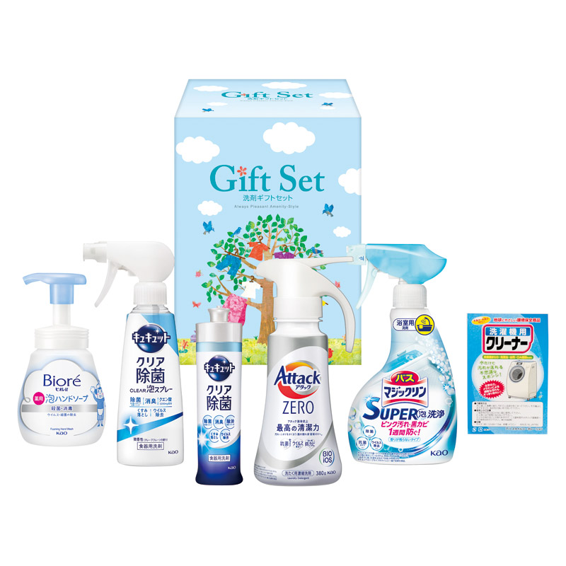 【内容】 花王アタックゼロワンハンド(約380g)、花王ビオレU泡ハンドソープ(約240ml)、花王キュキュットクリア除菌(約240ml)、花王キュキュットクリア除菌泡スプレー(約280ml)、花王バスマジックリン泡スプレー(約350ml)、洗濯機用クリーナーM×各1