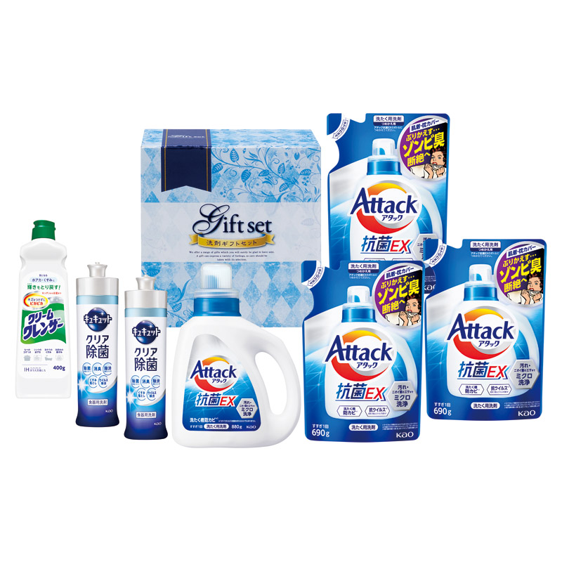【内容】 花王アタック抗菌EX(約880g)、クリームクレンザー(約400g)×各1、花王キュキュットクリア除菌(約240ml)×2、花王アタック抗菌EX詰め替え(約690g)×3