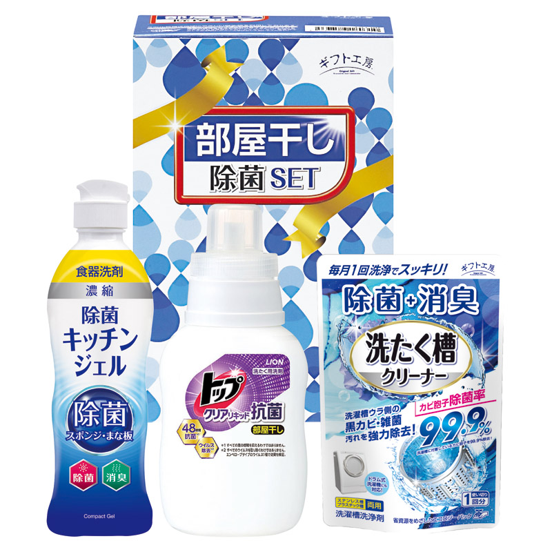 【内容】 ライオンクリアリキッド部屋干し用(約300g)、除菌キッチンジェル(約200ml)、洗たく槽クリーナー(約100g)×各1