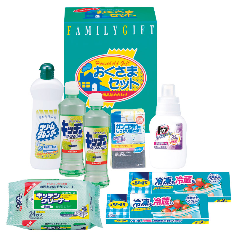 【内容】 ライオントップクリアリキッド抗菌(約300g)、クリームクレンザー(約400g)、キッチンクリーナー(24枚入)、抗菌ナイロンクリーナー×各1、キッチンリフレッシュコンパクト(約270ml)、リード冷凍も冷蔵も新鮮保存バッグ(S3枚)×各2