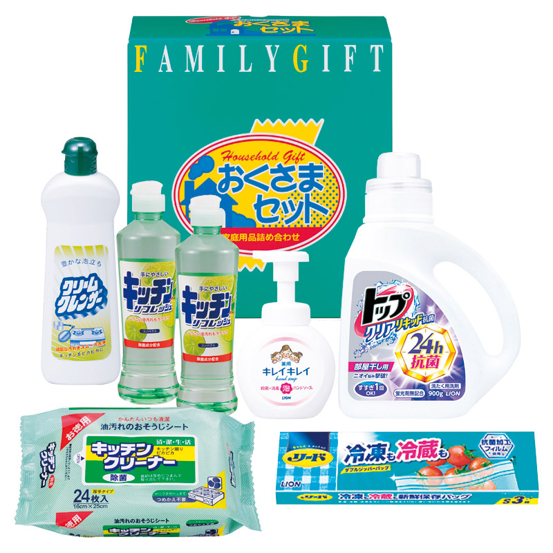 【内容】 ライオントップクリアリキッド抗菌(約900g)、ライオンキレイキレイ薬用泡ハンドソープ(約250ml)、クリームクレンザー(約400g)、リード冷凍も冷蔵も新鮮保存バッグ(S3枚)、キッチンクリーナー(24枚入)×各1、キッチンリフレッシュコンパクト(約270ml)×2