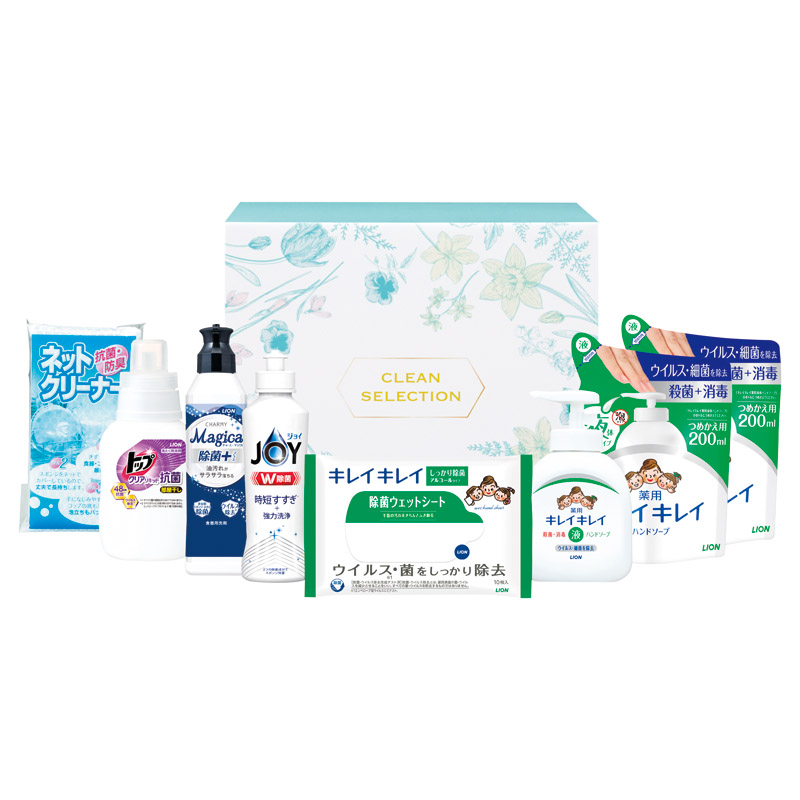 【内容】 ライオンキレイキレイ薬用液体ハンドソープ(約250ml)、ライオンキレイキレイ除菌ウェットシート(アルコールタイプ)(10枚)、P&G除菌ジョイコンパクト(約170ml)、ライオンマジカ除菌プラス(約220ml)、ライオントップクリアリキッド抗菌(約300g)、ネットクリーナー(1P)×各1、ライオンキレイキレイ薬用液体ハンドソープ詰め替え(約200ml)×2