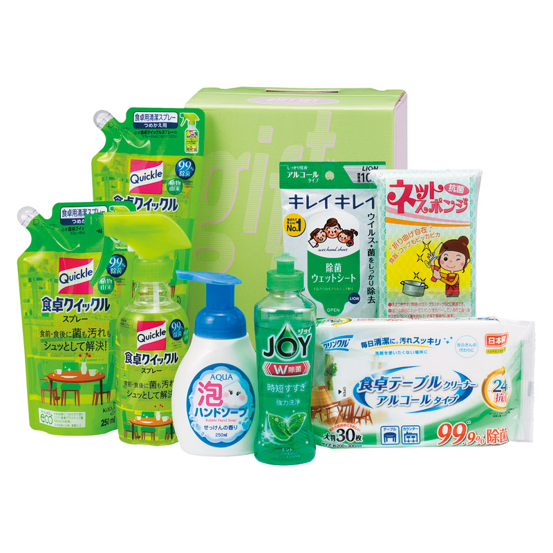 【内容】 花王食卓クイックルスプレー(約300ml)、P&Gジョイコンパクトローマミントの香り(約170ml)、アクア泡ハンドソープ(約250ml)、ライオンキレイキレイお手ふきウエットシート(アルコールタイプ)(10枚入)、クリンクル食卓テーブルふきん(30枚入)、ネットスポンジ(1P)×各1、花王食卓クイックルスプレー詰め替え(約250ml)×2