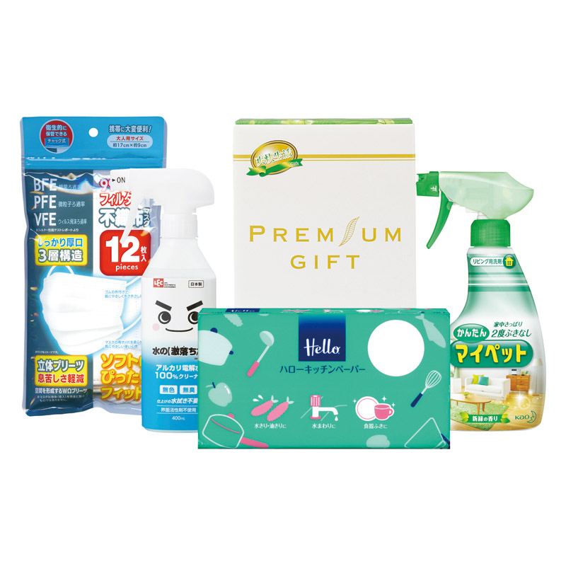 【内容】 花王かんたんマイペットハンディスプレー(約400ml)、レック水の激落ちくん(約400ml)、不織布マスク大人用(12枚)、ハローキッチンペーパー(70枚)×各1