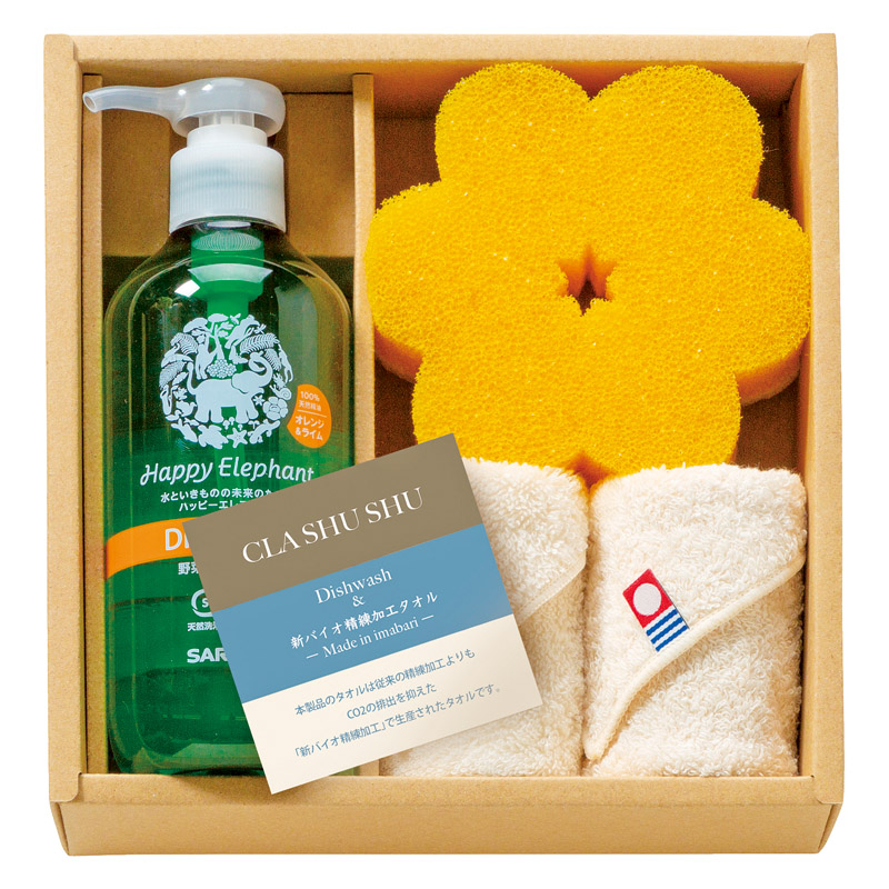 植物と酵母から生まれた未来の洗剤≫HappyElephant≫と、従来の精練加工よりもCO2排出削減を実現した無添加のやさしいファブリックのセットです。