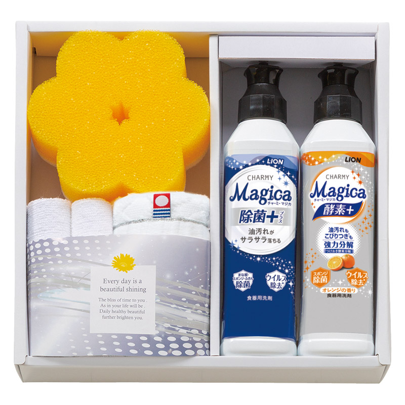 ナノ洗浄で油汚れもサラサラ。 食器洗いが手早く片付く、食器用洗剤ギフト。 ナノ洗浄でベタつく油汚れもサラサラ落とす食器用洗剤チャーミーマジカと今治タオルやマイクロファイバークロスがセットになった、役立つキッチン洗剤ギフトです。