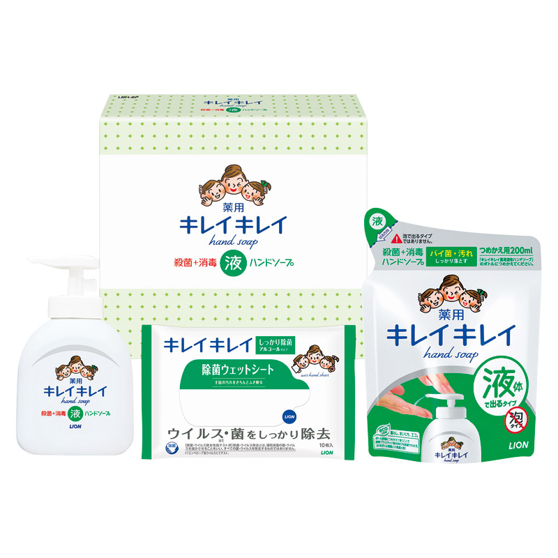 【内容】 キレイキレイ薬用液体ハンドソープ(約250ml)、キレイキレイ薬用液体ハンドソープ詰め替え(約200ml)、キレイキレイ除菌ウェットシート(10枚入)(アルコールタイプ)×各1