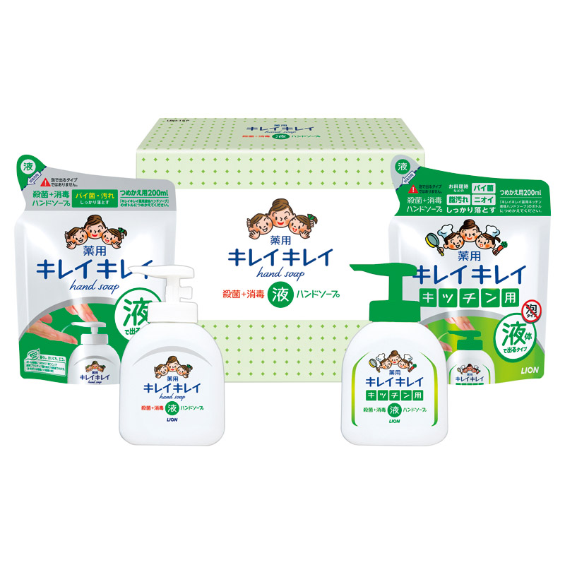 【内容】 キレイキレイ薬用液体ハンドソープ(約250ml)、キレイキレイ薬用液体ハンドソープ詰め替え(約200ml)、キレイキレイキッチン薬用液体ハンドソープ(約250ml)、キレイキレイキッチン薬用液体ハンドソープ詰め替え(約200ml)×各1