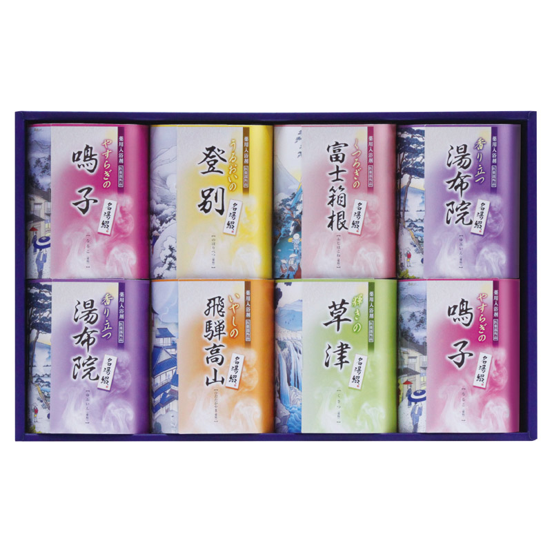 幅広い層に人気の名湯、秘湯をモチーフにした薬用入浴剤です。 保湿成分(ケイ酸ナトリウム)配合でお肌しっとりおだやかな香り立ちのぼるギフトセットです。