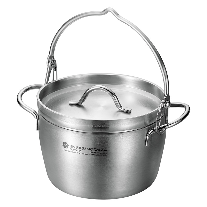 鍋の本体は、熱伝導性に優れたアルミニウムを耐久性と保温性に優れたステンレス鋼でサンドした3層構造(3LAYERS)。 IHはもちろん、ガス火やオーブン調理、アウトドアでの焚火や炭火にも対応します。 使い始めのシーズニング(油慣らし)の必要が無く、蓋はステンレス3mm厚と重いので、アウトドアでのご飯の炊き込みや煮込み調理に最適です。 ツルは着脱式でアウトドアだけでなく、インドアでも活躍します。