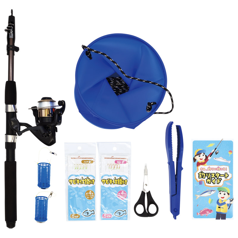 釣竿と仕掛け、その他便利なグッズがセットになった初心者でも簡単に釣りが始められるセット。 サビキ釣り用、あとはエサをそろえるだけ。
