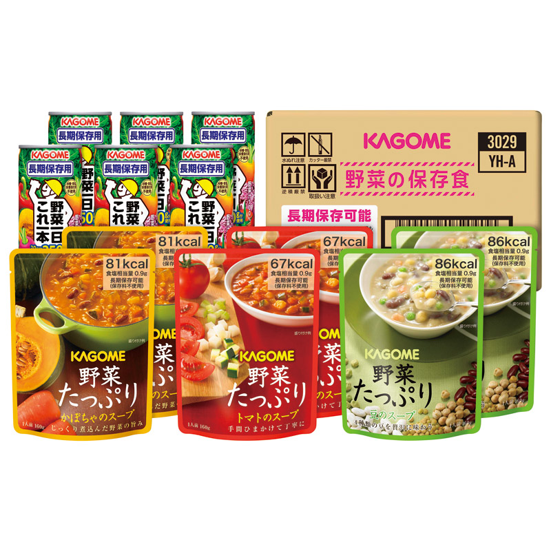 【内容】 野菜一日これ一本長期保存用(約190g)×6、野菜たっぷりトマトのスープ(約160g)、野菜たっぷりかぼちゃのスープ(約160g)、野菜たっぷり豆のスープ(約160g)×各2