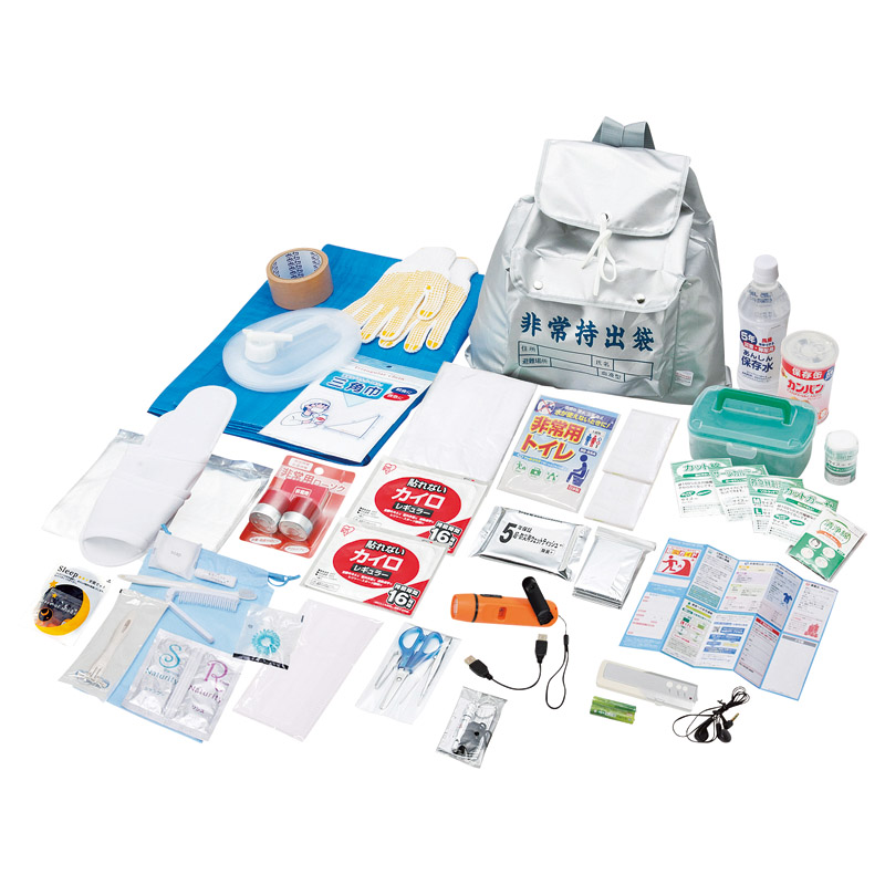【内容】 リュック型非常袋(約420×400×80mm)×1、折りたたみウォーターバッグ(3リットル)、すべり止め手袋、コンパクトFMラジオ、スマホ充電対応ダイナモライト、三角巾、ゴミ袋45リットル(10枚)、防寒シート、防災用ウェットティッシュ(20枚)、布テープ、ホイッスル、ブルーシート(2畳用)、非常用トイレ、ハサミ、ピンセット、耳かき、毛抜き、救急箱、カット綿(3枚入)、カットガーゼ(3枚入)、包帯、救急絆創膏(2サイズ3枚)、サージカルテープ、清浄綿(2枚入3包)、スリッパ、非常用ローソクセット、カンパン(100g)、保存水(500ml)、宿泊セット用ポーチ、カミソリ、ハブラシセット、二つ折りコンパクトブラシ、シャンプー&リンス、石ケン、タオル、ヘアーバンド、安眠セット(アイマスク)、安眠セット(耳栓)、防災ガイド×各1、ポケットティッシュ(8W)、カイロ、マスク×各2