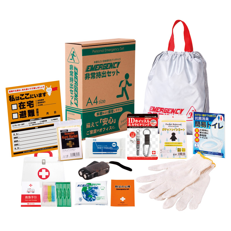 【内容】 非常持出袋(約335×390mm)×1、防災の心得、IDホイッスル&カラビナリング、レインコート、抗菌消臭トイレ、ダイナモLEDライト、軍手、アルミブランケット、除菌アルコールウェットティッシュ、緊急避難カード、水に流せるペーパー、救急4点セット×各1