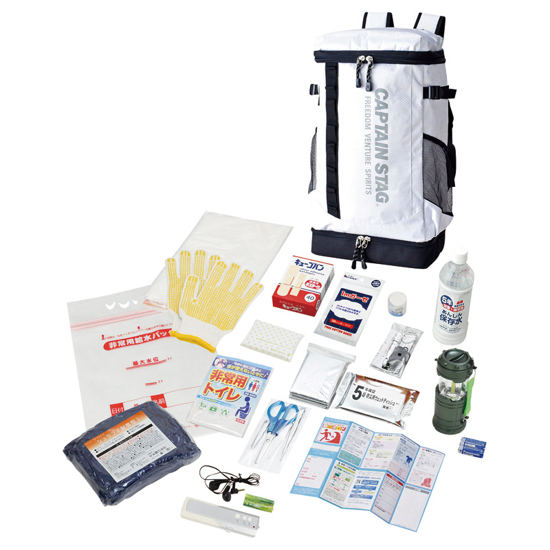 【内容】 リュック(約500×280×150mm)×1、コンパクトFMラジオ、2WAYランタン、シュラフ、非常用給水バッグ(5リットル)、防災用ウェットティッシュ(20枚)、防寒シート、ホイッスル、すべり止め手袋、非常用トイレ、ポケットティッシュ(8W)、ゴミ袋45リットル(10枚入)、防災ガイド、救急用絆創膏2サイズ(40枚入)、保存水(約500ml)、ガーゼ、包帯、ハサミ、ピンセット、耳かき、毛抜き×各1