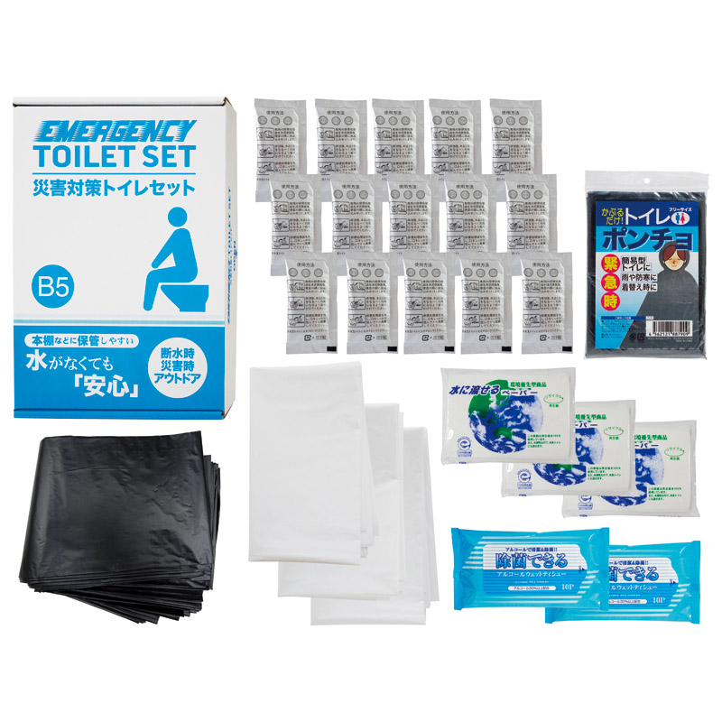 【内容】 吸収性凝固剤、排便処理袋×各15、収納外袋、水に流せるペーパー×各3、除菌アルコールウェットティッシュ×2、トイレポンチョ×1