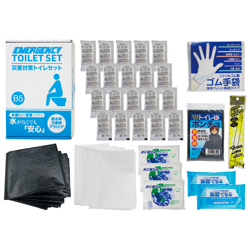【内容】 吸収性凝固剤、排便処理袋×各20、収納外袋×4、水に流せるペーパー×3、除菌アルコールウェットティッシュ×2、トイレポンチョ、発光スティック、ゴム手袋×各1