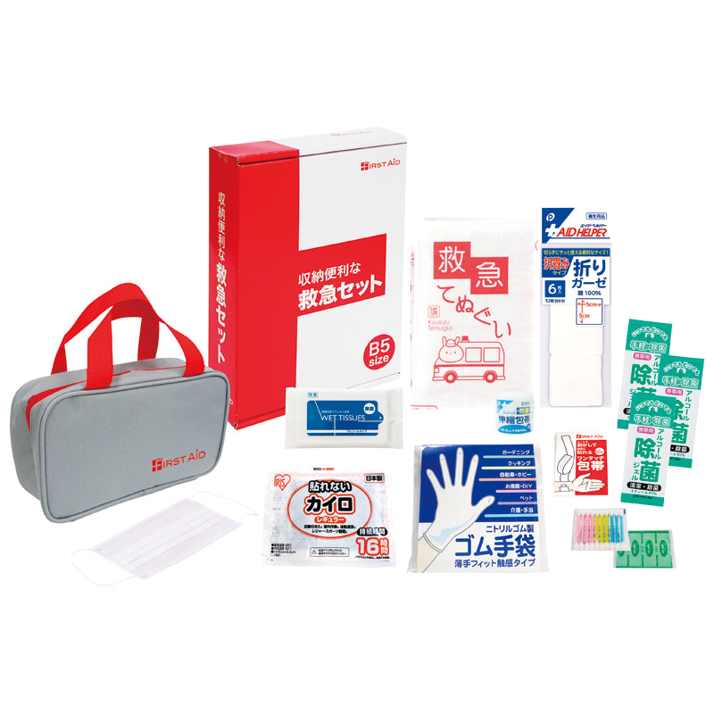 【内容】 収納ポーチ(約135×235×60mm)×1、抗菌伸縮包帯、カイロ、救急てぬぐい、折りガーゼ、除菌ウェットティッシュ、マスク、ワンタッチ包帯、綿棒(10P)、絆創膏(5P)、ゴム手袋×各1、除菌ジェル×3
