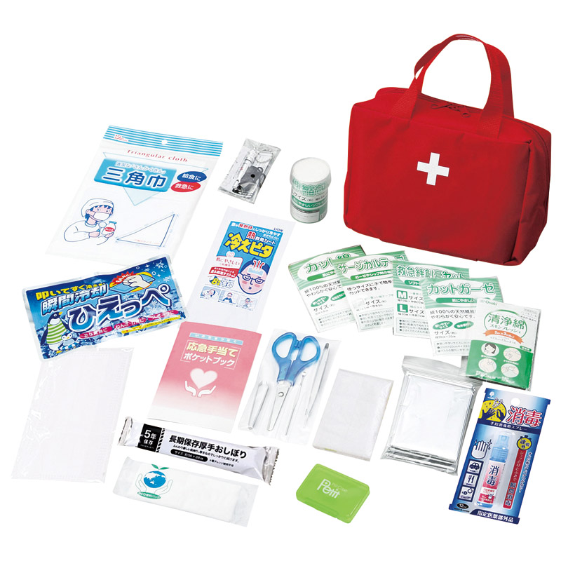 【内容】 救急バッグ(約230×100×155mm)×1、カット綿、カットガーゼ、包帯、救急絆創膏(2サイズ×3枚)、サージカルテープ、清浄綿(2枚入×3包)、ハサミ、ピンセット、毛抜き、耳かき、冷却パック、手指消毒スプレー(約12ml)、ECO便利バッグ、ピルケース、三角巾、マスク、防寒シート、熱救急シート(2枚入)、大判厚手おしぼり、ホイッスル、ポケットティッシュ(8W)、応急手当てポケットブック×各1
