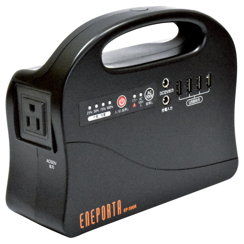 コンパクトなポータブル電源。 懐中電灯付きで災害時にも安心。 1.6kgの軽量ボディに大容量50400mAリチウムイオン充電池搭載。 出力容量:最大100W出力端子:AC100V3芯/2芯共通×1、DC12V(外径/内径:直径5.5/直径2.1mm)×1、USB(DC5V)×4懐中電灯充電時間:8~9時間使用可能時間目安(満充電):LED照明(20W相当)5.5時間、液晶テレビ(32型、70W相当)2時間、スマートフォン充電(電池容量2000mA)約8回