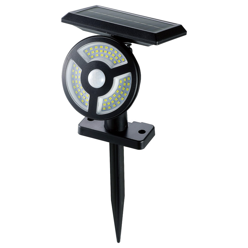 人を感知してライトがつくソーラー充電式防犯ライト。 壁にも取り付け可能。 電源:光電池防水性能/IPX54相当