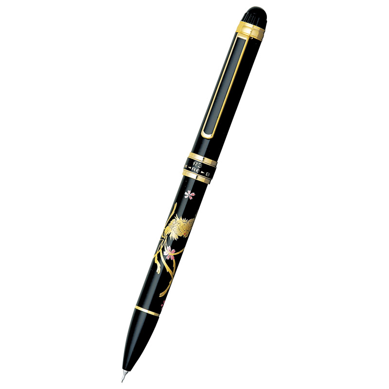 シルク描法で下絵処理した後に伝統的な蒔き仕上げを施した近代蒔絵の技法で軸に鮮やかに刷り込み格調高く仕上げました。 便利な回転切替式3機能タイプ(ボールペン黒、赤、シャープペンシル0.5mm)で、贈り物にもおすすめです。