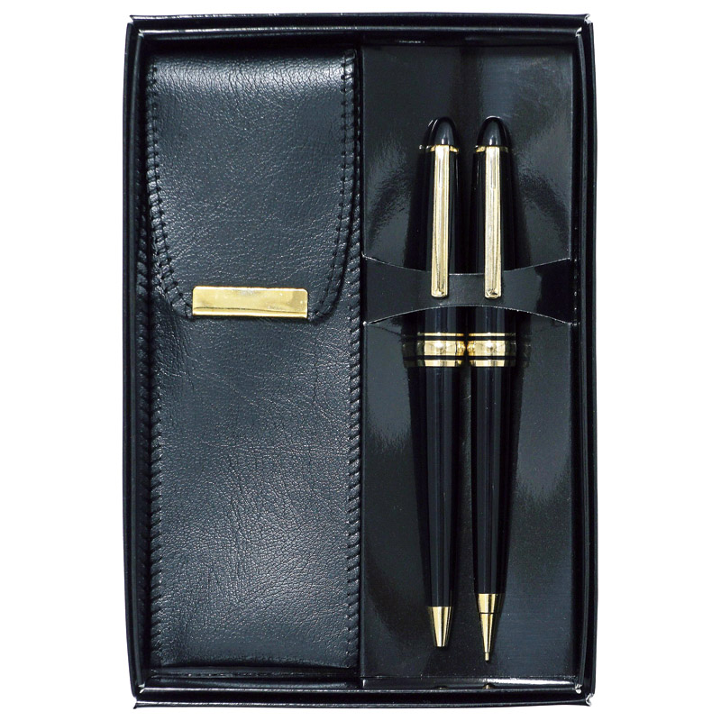 PU材ウレタン人工皮革によるホック式ケース。 軸は珍しいアクリル成型レトロ調。 中心リングは真鍮挽物。 上軸全体ノックのキャップスライド式ボールペン、シャープペンセット。