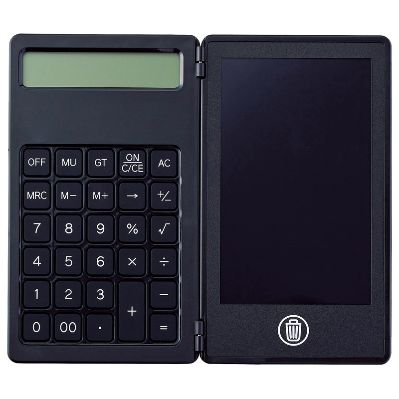人気の電子メモに電卓が付いた高機能商品。 持ち運び時は液晶部分が内側に折りたたまれるので、画面をキズ付ける心配がございません。
