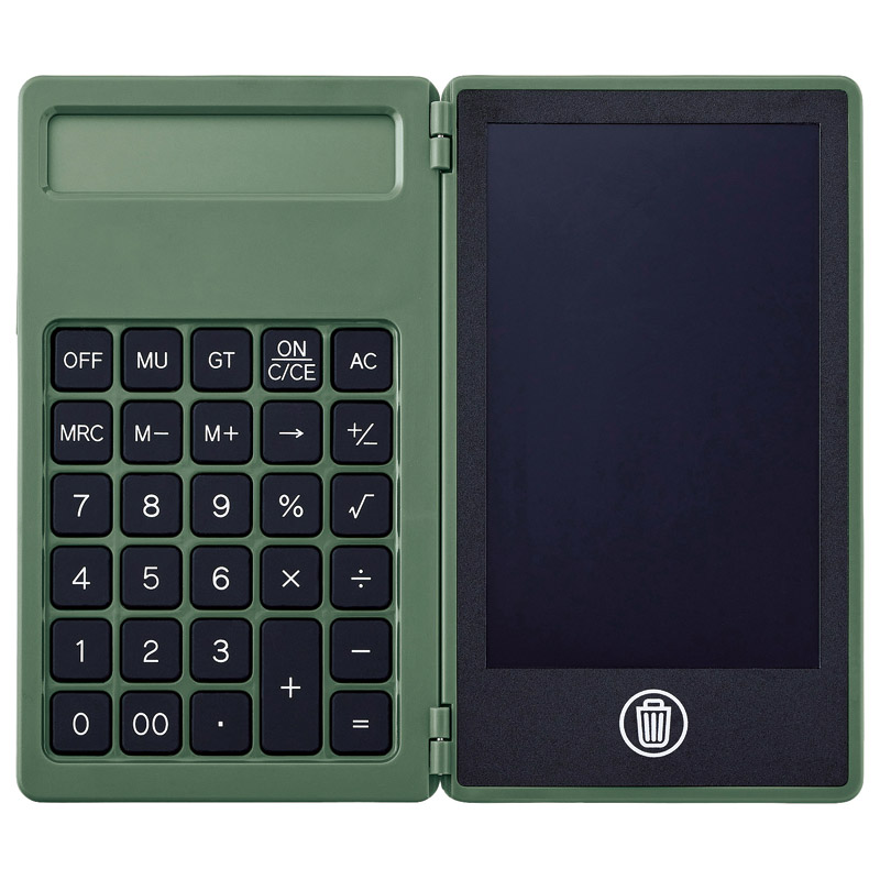 人気の電子メモに電卓が付いた高機能商品。 持ち運び時は液晶部分が内側に折りたたまれるので、画面をキズ付ける心配がございません。