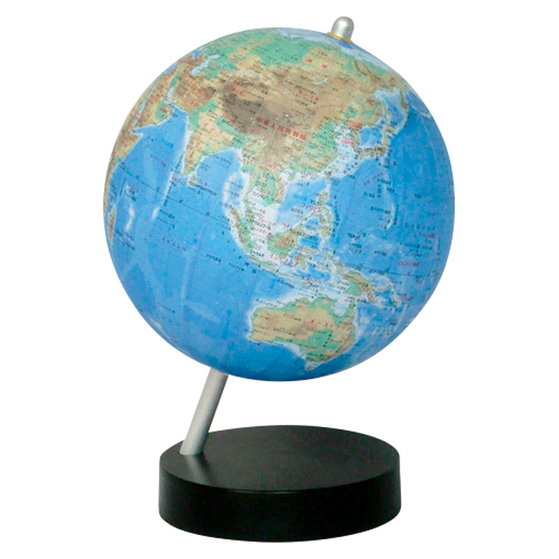 地勢図(標高別の色分)タイプの卓上型地球儀です。 縮尺1億分の1の球体を自転軸1本で支えるシンプルな地球儀です。 机の上のインテリアとしてもお薦めです。