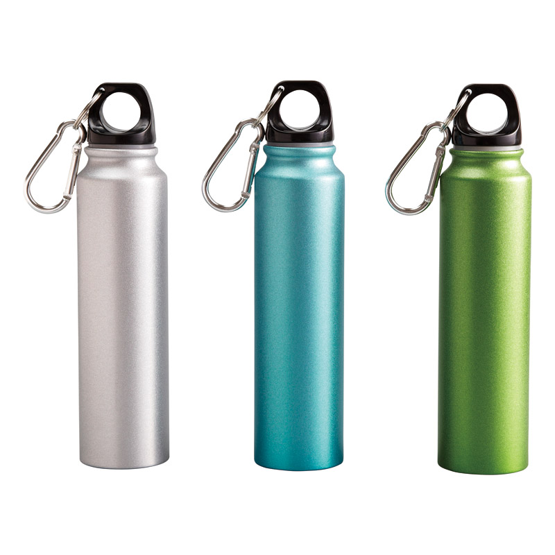 カバンの中で場所を取らないスリムなアルミボトル。 携帯に便利なカラビナ付き。