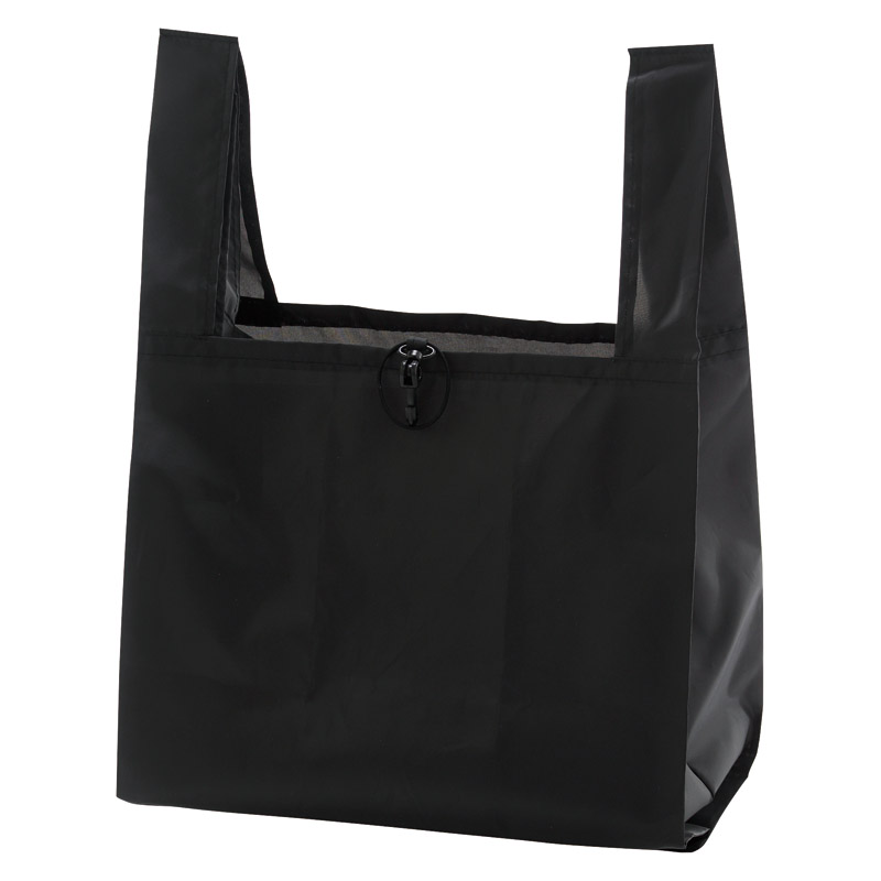 リサイクルPET素材仕様のエコバッグ。 コンビニやスーパーのお弁当が入れやすいマチ広タイプ。 コンパクトにまとめられるゴムと持ち運びに便利なフック付。