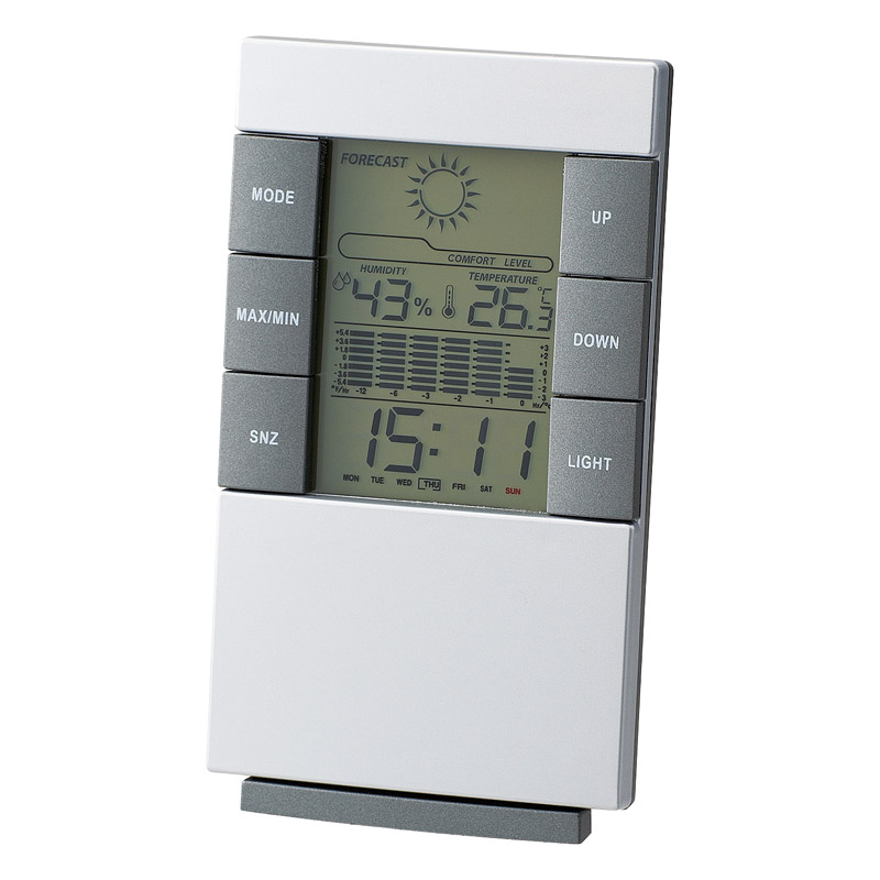 天気予報や12時間の気温の移り変わりグラフまで付いた見やすい多機能時計です。 時計、アラーム、スヌーズ、温度計、湿度計、カレンダー、バックライト。