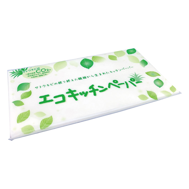 再生原料バガス(さとうきび繊維)を40%配合した、エコタイプのキッチンペーパーになります。 森林伐採低減及び産業廃棄物低減につながります。