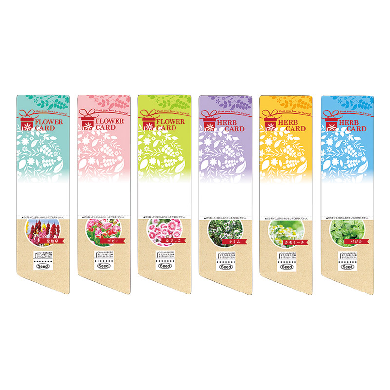 土に差し込むだけでタネまきができる素敵なカードです。 指示線通りカットすると上部はしおりに、下部はタネのついたフラワーカードになります。