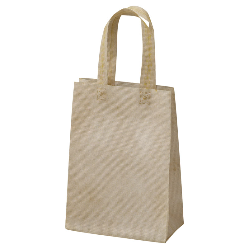 おしゃれなモカ色でマチ付きのスタイリッシュなデザインのRPET不織布バッグ。 回収された使用済みペットボトルを原料(100%)として生産された生地で作られています。