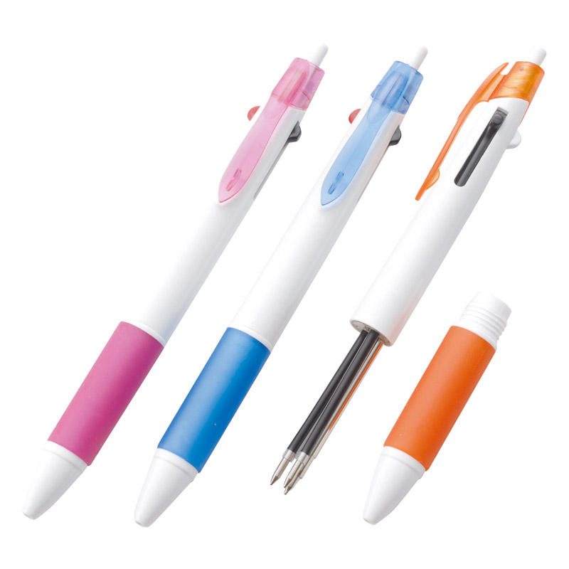 多色ペンノック棒に、シャープペンの構造を組み込んだ2色ボールペン+シャープペン(3メカ)。 ラバーグリップ付。
