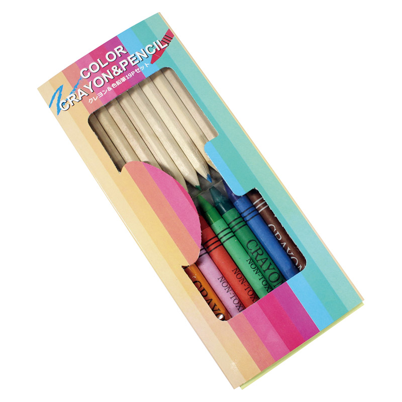 コンパクトサイズのクレヨン9本、色鉛筆10本が入ったお絵かきに便利なセットです。