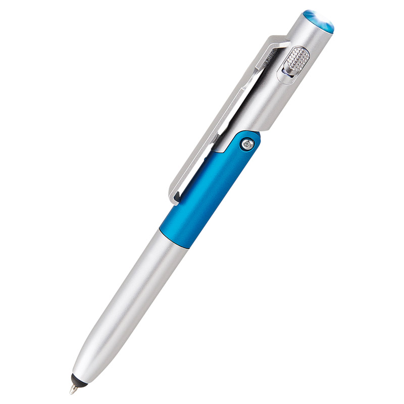タッチペンの先からボールペンが出る便利なライト付ペンです。 本体が折れて携帯電話スタンドとして使用できるユニークな機能付です。
