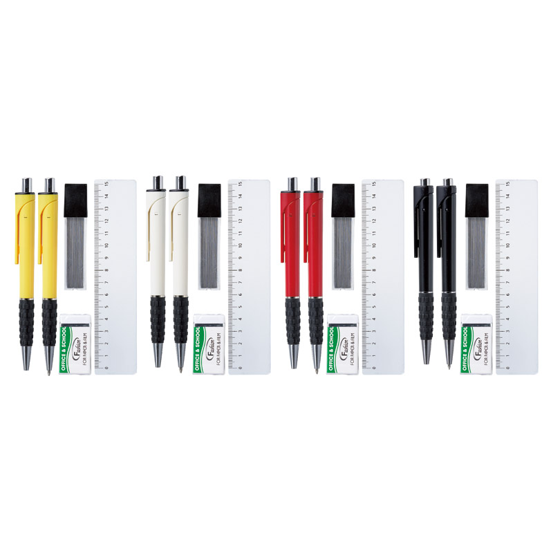 【内容】 ボールペン(約直径11×136mm)、シャープペン(約直径11×136mm)、定規(約160×35×2mm)、ケシゴム、替え芯×各1